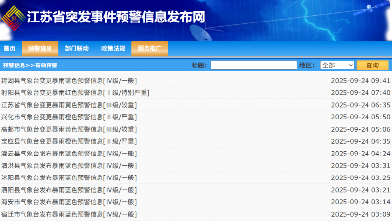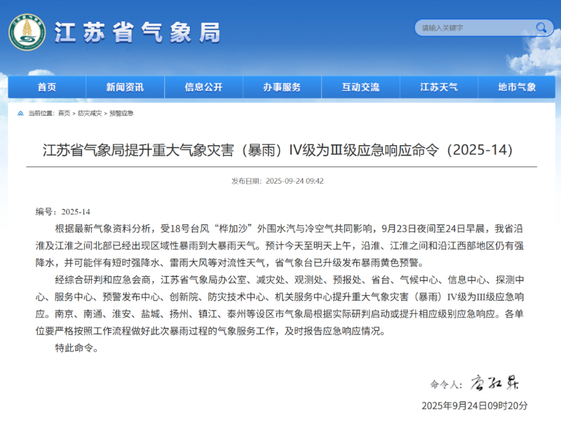 江苏省气象局提升重大气象灾害(暴雨)IV级为Ⅲ级应急响应命令: