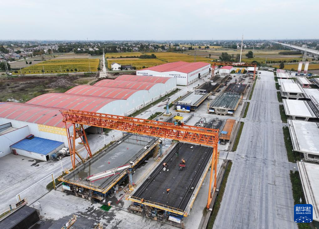 10月27日拍摄的中铁十一局沪渝蓉高铁沪宁段搬经制梁场作业现场(无人机照片)。