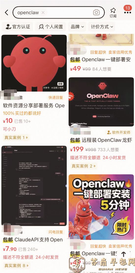 扬子晚报/紫牛新闻记者在闲鱼平台检索发现,与OpenClaw相关的代安装商家已有数百家,报价从十元、几十元到数百元、上千元不等,价格差距很大。低价服务多以“基础安装”“远程指导”为主,价格较高的则主打“全套部署”“环境配置”“后续维护”等一条龙服务。