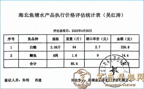 (图片说明:法院委托专门评估公司对吴红涛鱼塘水产品价值评估,其价值仅241.2元卖鱼款。但要收取200多万元“占用费”)