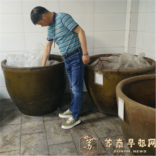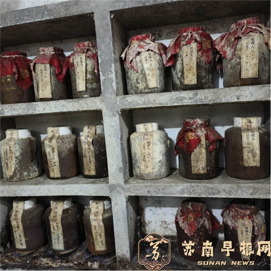 采访时,记者一行在周友智的引领下,参观了地窖发酵间。推进发酵车间门,冷气瘦瘦,浓浓的酒糟香扑鼻而来。周友智一边介绍说,空气凉,是因为恒温一直保持在25度左右,一边用手指着排列整齐的发酵大缸,介绍发酵的配比情况。他说,一般按100斤高粱,100斤小麦,5斤白茶,3斤白茶叶制作的红茶,加上天目湖的水,进行配比拌和发酵。当他掀开一个大缸的铺盖时,展现眼前的是金橙橙的酒糟,煞是好看。周友智用手捧起酒糟,并合力捏紧,只见醇香的白茶酒就溢了出来,变成一条线,让我们鼻翼一嗅,真的沁人心脾,很是陶醉。周友智还给我们介绍蒸馏取酒情况。然后,带我们坐小货电梯,到上面的储藏间。同样,储藏间排列着整齐的储酒大缸。储藏间的墙面,排列满满“私人定制”的白茶酒罐。酒罐个头明显比储酒大缸小,但也足有大几十斤。酒罐正面贴着封条,写着定制单位或定制个人姓名以及定制的时间。有的是前年的,有的是去年的,还有今年的。因为储藏间阴冷,这些“私人订制”的储藏酒罐斑斑驳驳。周友智开玩笑说,这样斑驳有历史感的酒罐只能在贵州溶洞酒窖里才能看得到。