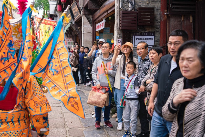 中马灯阵法多变、跳五猖古老威严、丰收锣鼓欢快喜庆……“五一”假期,众多民俗表演在高淳老街轮番上演,碰撞出节日的盛大与喜悦。游客纷纷拍照打卡留念,一派欢乐祥和的节日氛围。