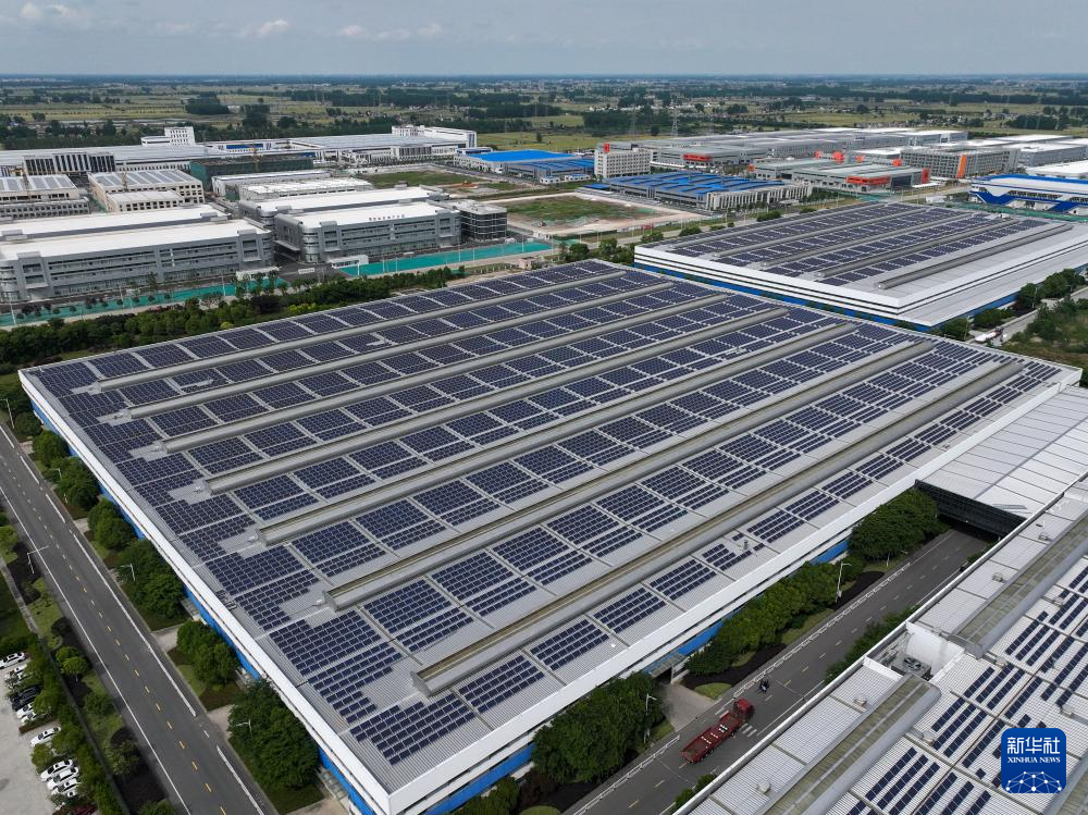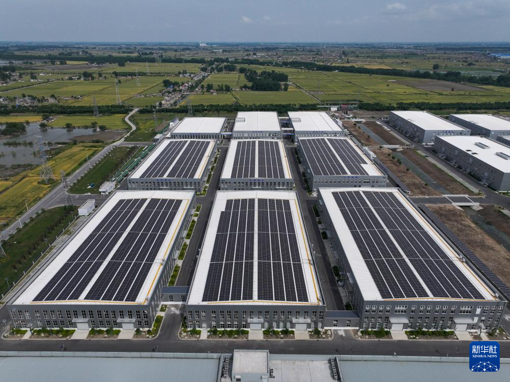 这是5月21日拍摄的扬州市宝应低碳智造产业园,产业园厂房顶部加装了太阳能电池板,供给工业用电(无人机照片)。