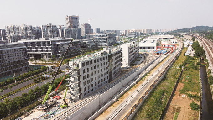 在红山南路旁的9号线曹后村车辆段,2栋综合楼已完成封顶。与传统车辆段施工不同,这里在国内首次使用了预制清水混凝土外墙挂板。