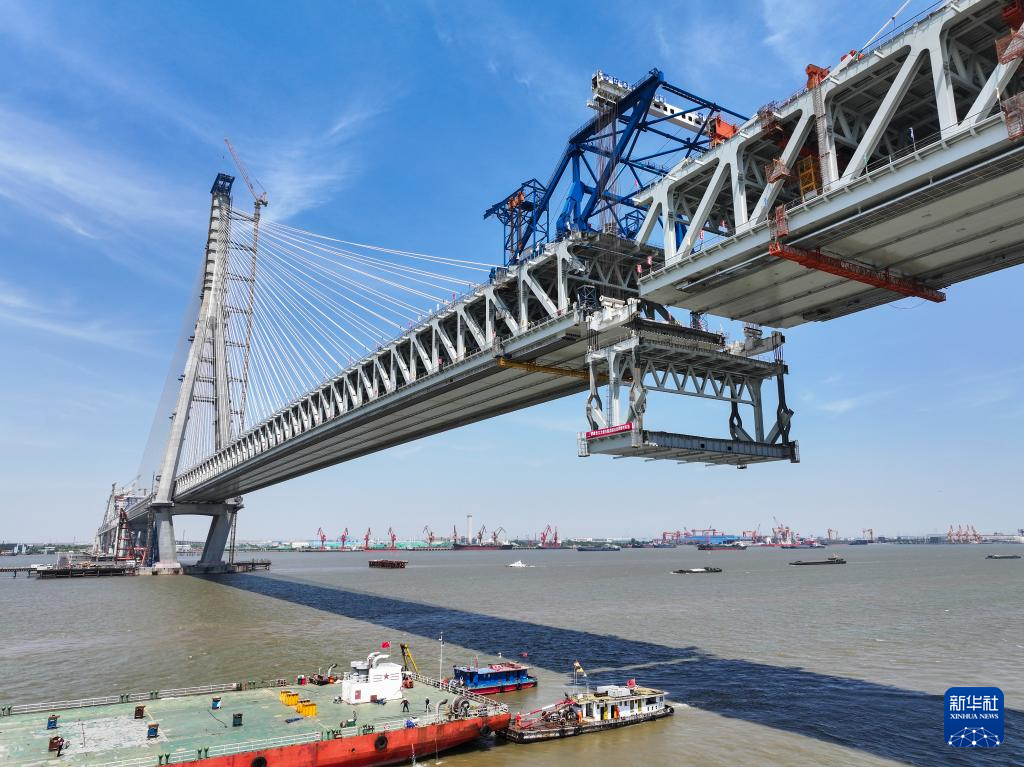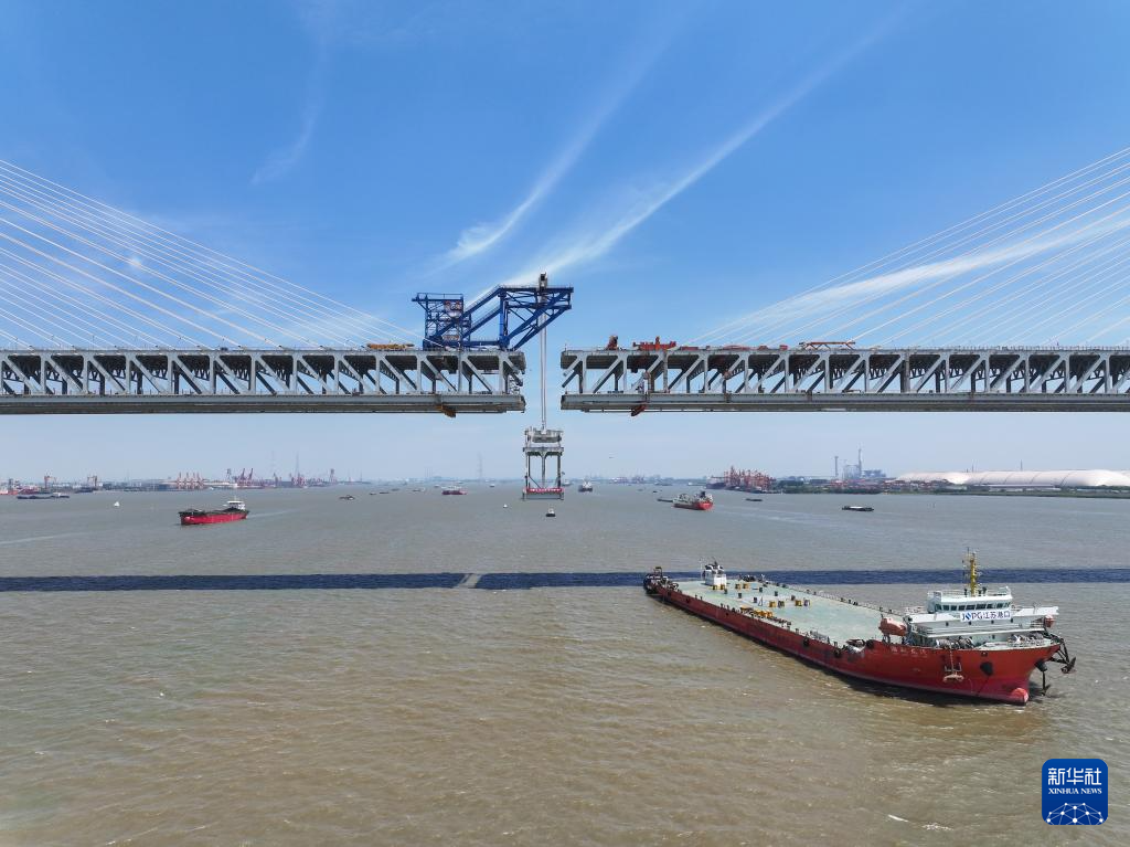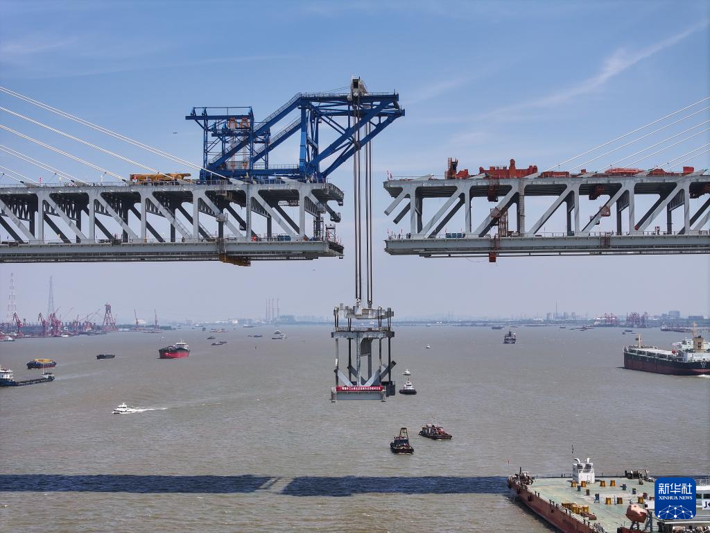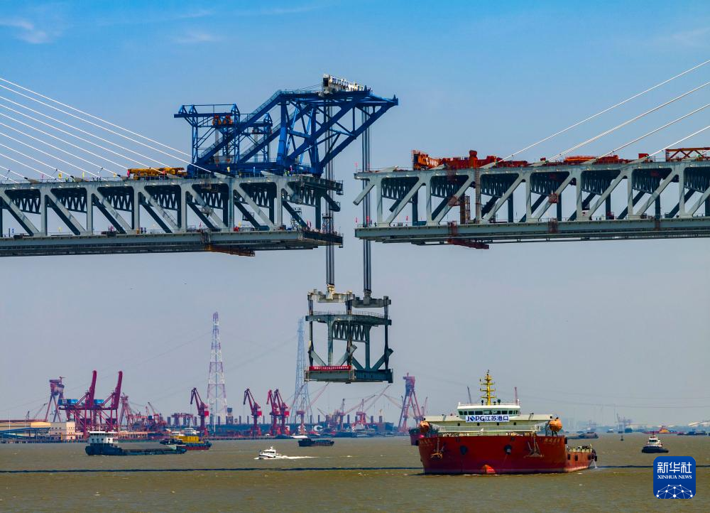 5月29日拍摄的常泰长江大桥主航道桥合龙段钢桁梁吊装现场。