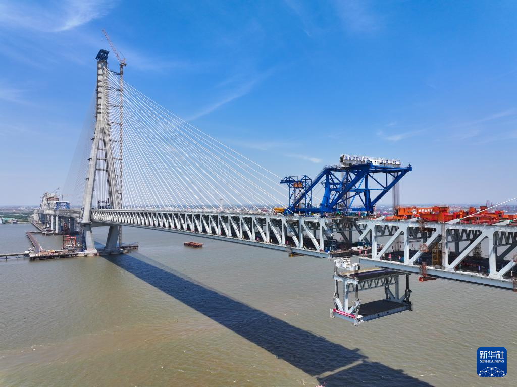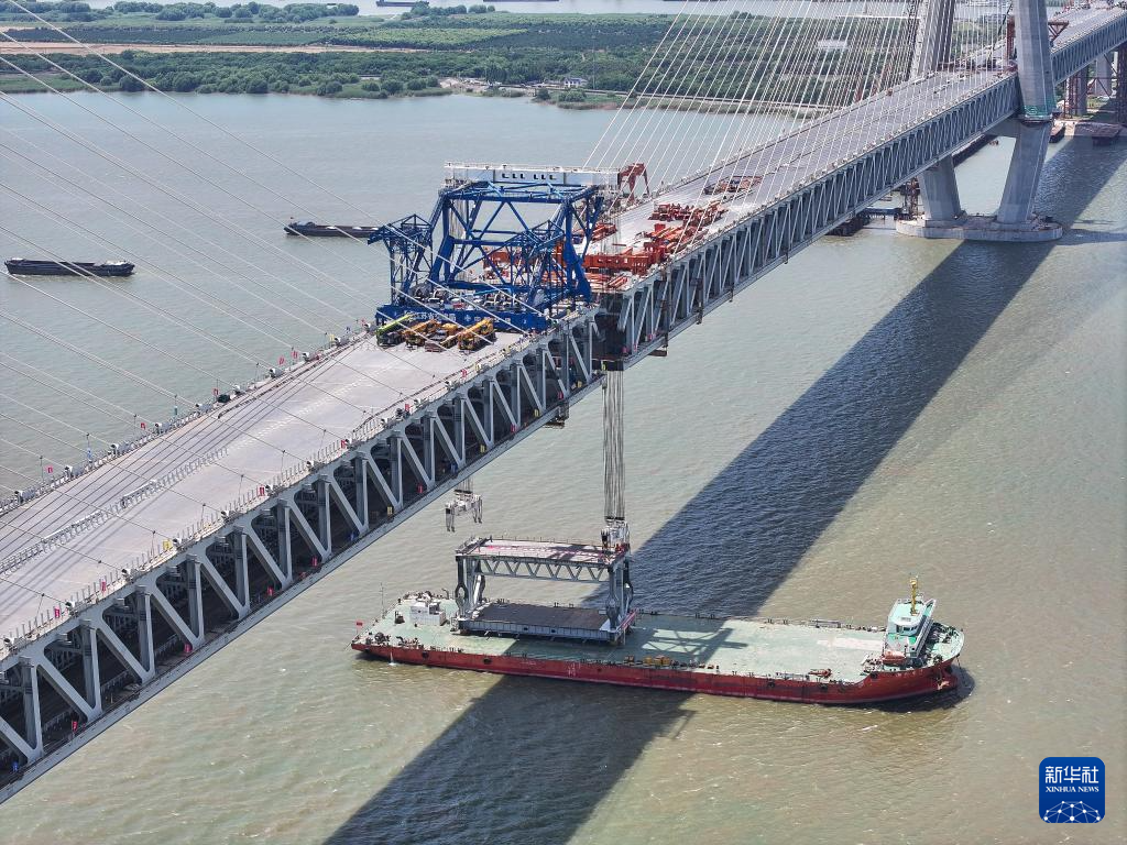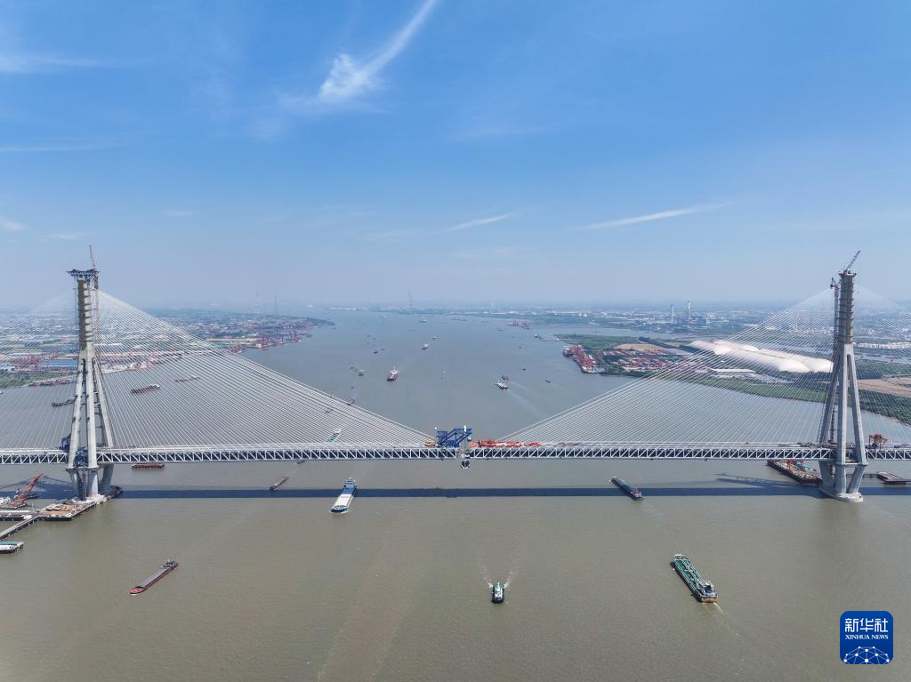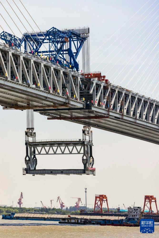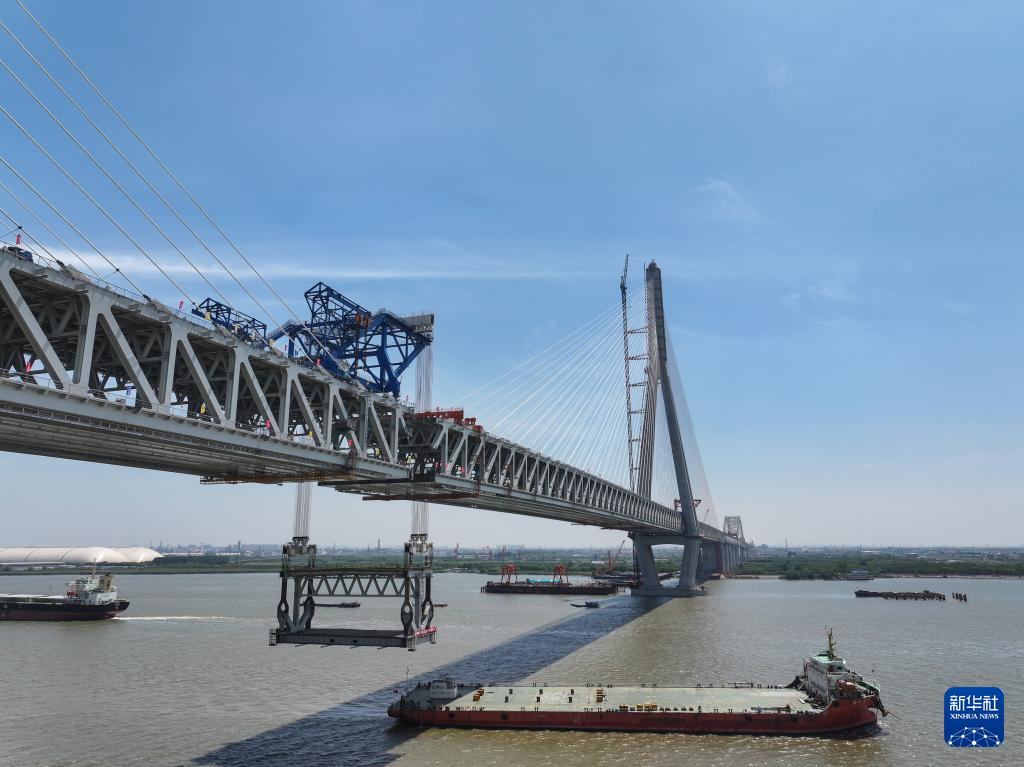 5月29日拍摄的常泰长江大桥主航道桥合龙段钢桁梁吊装现场。