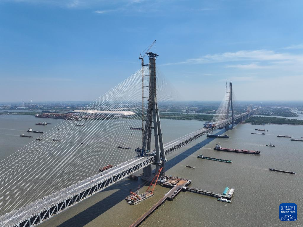 5月29日拍摄的常泰长江大桥施工现场(无人机照片)。