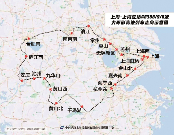 此前网上热传的“长三角大环形高铁”随着中国铁路上海局集团有限公司(下简称上海局集团)于6月1日发布新的列车运行图终于得到证实。据悉,在6月15日起长三角铁路实施的新列车运行图中,不仅旅客列车开行总数将达到1325.5对,其中更将首次尝试开行上海—上海虹桥G8388/9/8次大环形高铁列车1列。该列车在连接上海、南京、合肥、杭州等4座长三角中心、副中心城市的同时,也让黄山、九华山、千岛湖等多个风景名胜区实现一车直达。