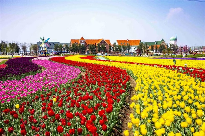 在郁金香种植区,流线型大色块种植,辅以一湾流动的人工湖,展示出以小见大、一步一景的特点,郁金香花海非常美观漂亮。黄色、红色、紫色,成片成片的郁金香正竞相开放。园区西侧的童话乐园还搭配具有荷兰风情的巨大风车造型,结合园区人工堆叠的地形高差和人工湖,郁金香花海波浪起伏的地势与碧蓝梦幻的湖水交相呼应,美不胜收。
