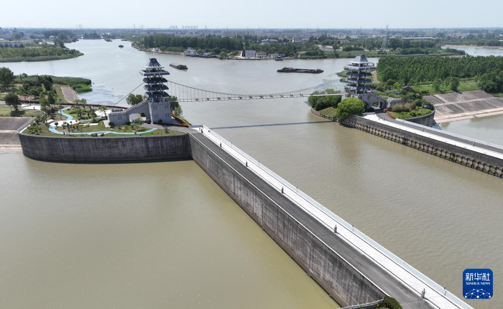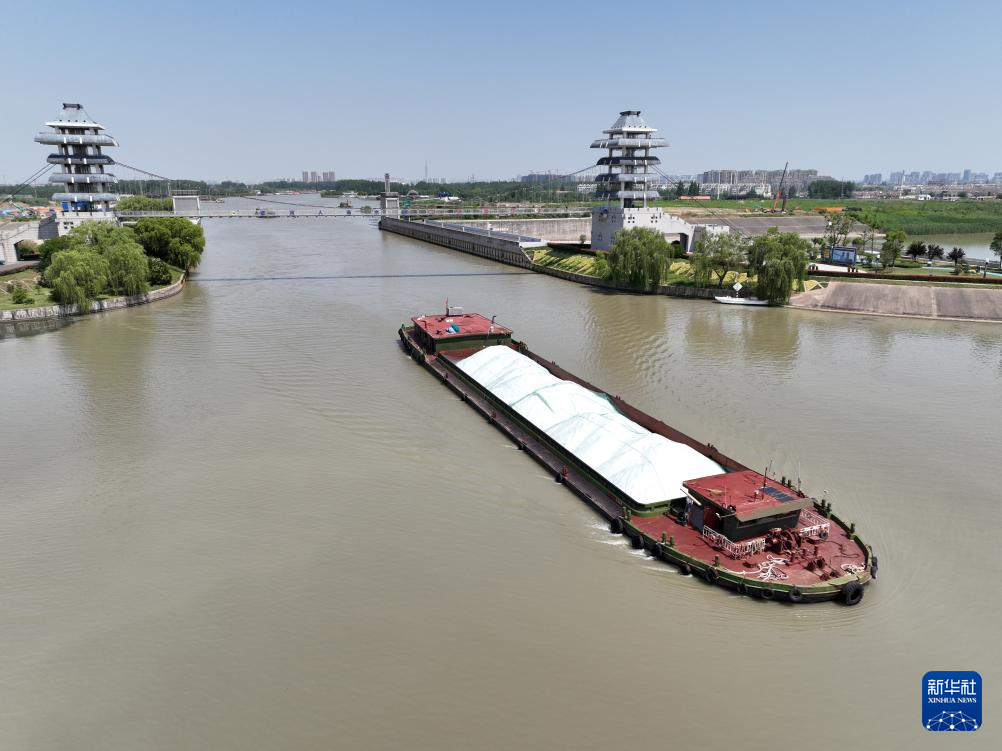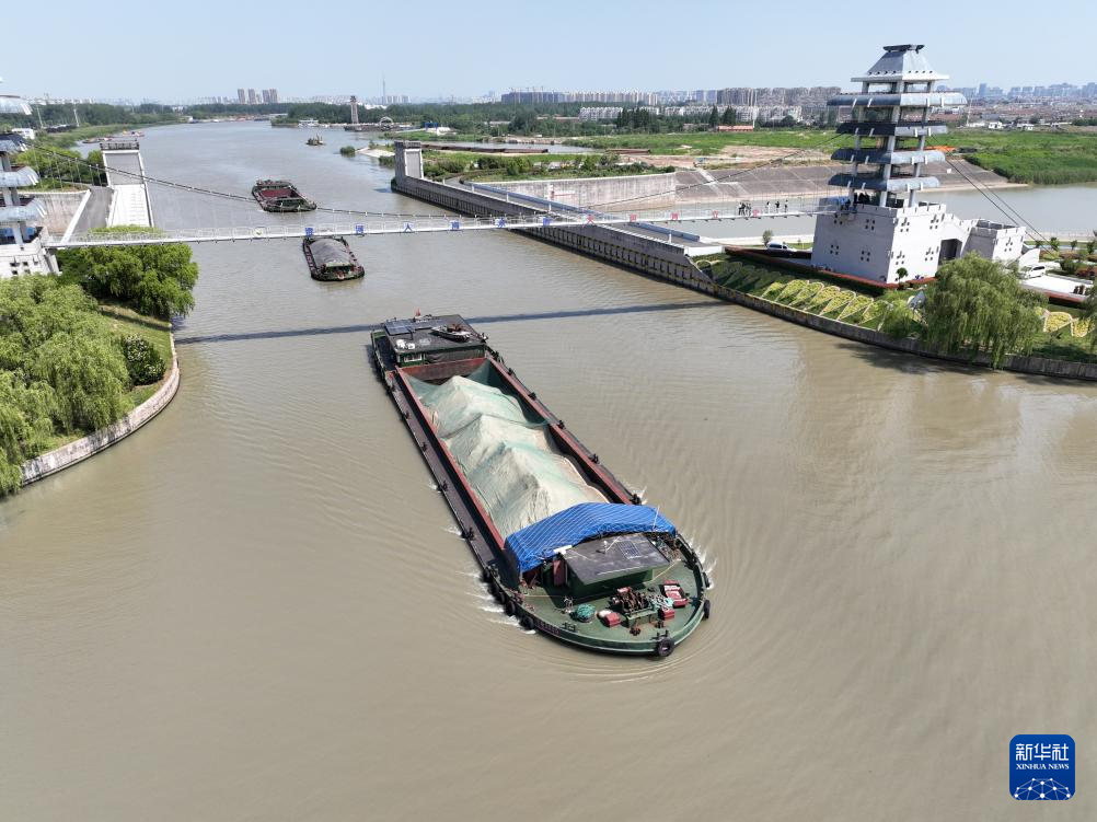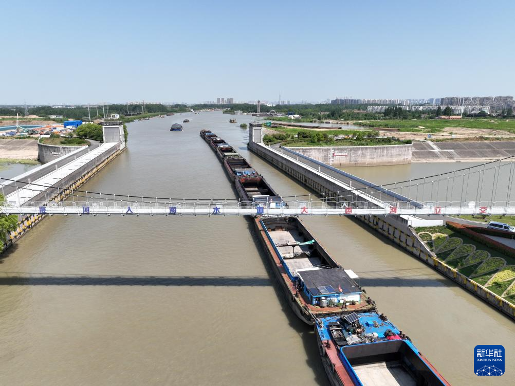 初夏时节,江苏省淮安市水上立交京杭大运河水道运输煤炭、建材等物资的船只往来穿梭,一派忙碌。