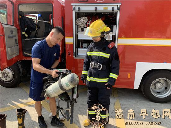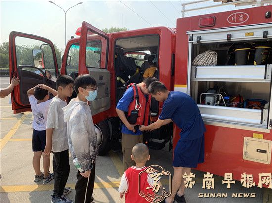 在参观活动即将结束时,孩子们与消防员们合影留恋,并送上对消防员的崇拜和感激。(图文/曹盼)