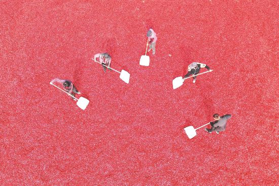 苏南早报网讯 11月20日,亳州市谯城区大杨镇郭万村杨敏亮小辣椒专业种植合作社,农事钟点工在晾晒小辣椒。近年来,该镇立足资源禀赋,优化产业结构,按照“党支部+合作社+农户”的模式大力发展小辣椒产业,推广种植新技术,推动小辣椒种植规模化、生产标准化、服务便捷化、加工链条化、营销品牌化,通过订单农业带动群众增收致富,把小辣椒做成了乡村振兴“大产业”。通讯员 武清海 王 震 摄