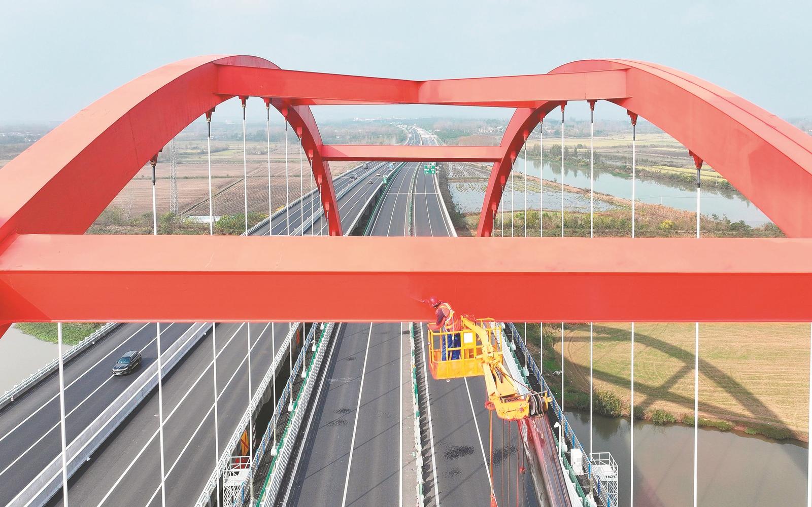 苏南早报网讯 12月7日,在G36宁洛高速蚌明改扩建01标项目池河特大桥主桥,工人正使用设备给大桥喷漆,为年底通车做准备。G36宁洛高速明光至蚌埠段路线全长80.903公里。项目建成通车后,将进一步改善蚌埠及周边交通出行条件。记者 李 博 摄