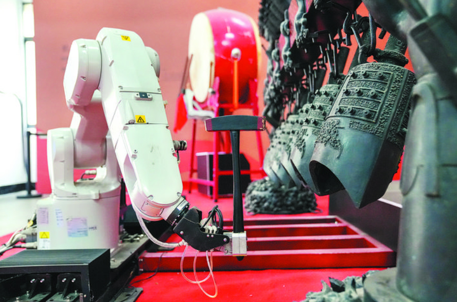 苏南早报网讯 乐谱变成代码、音符变成指令……在“曾侯乙编钟”和大鼓间演奏的竟是机器人。合肥本土企业磐石科技,耗时四年研发、优化出“钟鼓齐鸣”项目,在仿制的“曾侯乙编钟”上敲击《清明上河图》《神话》等曲目。12月29日,这支机器人乐队亮相首届《中国科技创新盛典》,将安徽传统民乐凤阳花鼓改编成了全新的摇滚乐版本,实现科技与艺术融合。记者 刘小容/文 罗浩宇/图