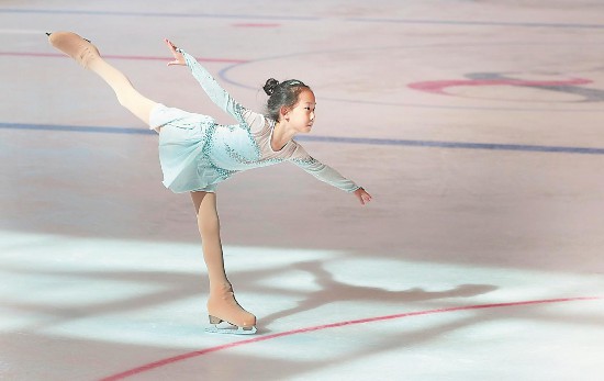 1月12日,在合肥市蜀山区缤纷万象滑冰场,来自荷叶地街道的7岁女孩王绎澄正在练习花样滑冰。