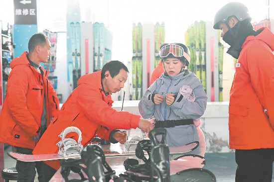 1月3日,游客在六安市霍山县大别山滑雪旅游度假区领取滑雪用具。