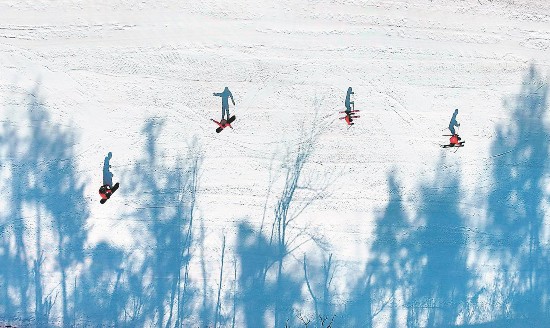 1月3日,在六安市霍山县大别山滑雪旅游度假区,滑雪者与树影相映成趣。