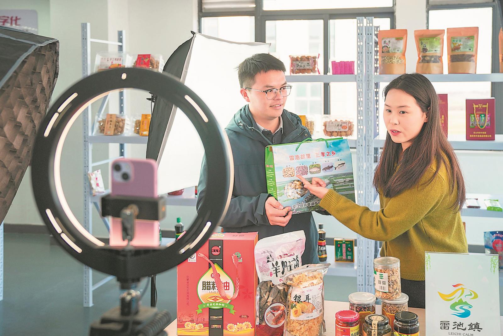 苏南早报网讯 1月10日,望江县雷池镇雷江村主播在网络带货。该镇积极推进“一村一品”,在全镇12村建立12个直播间,以“短视频+直播”模式,推介当地的杂粮、有机果蔬、农家小吃等特产。 记者 李博 摄