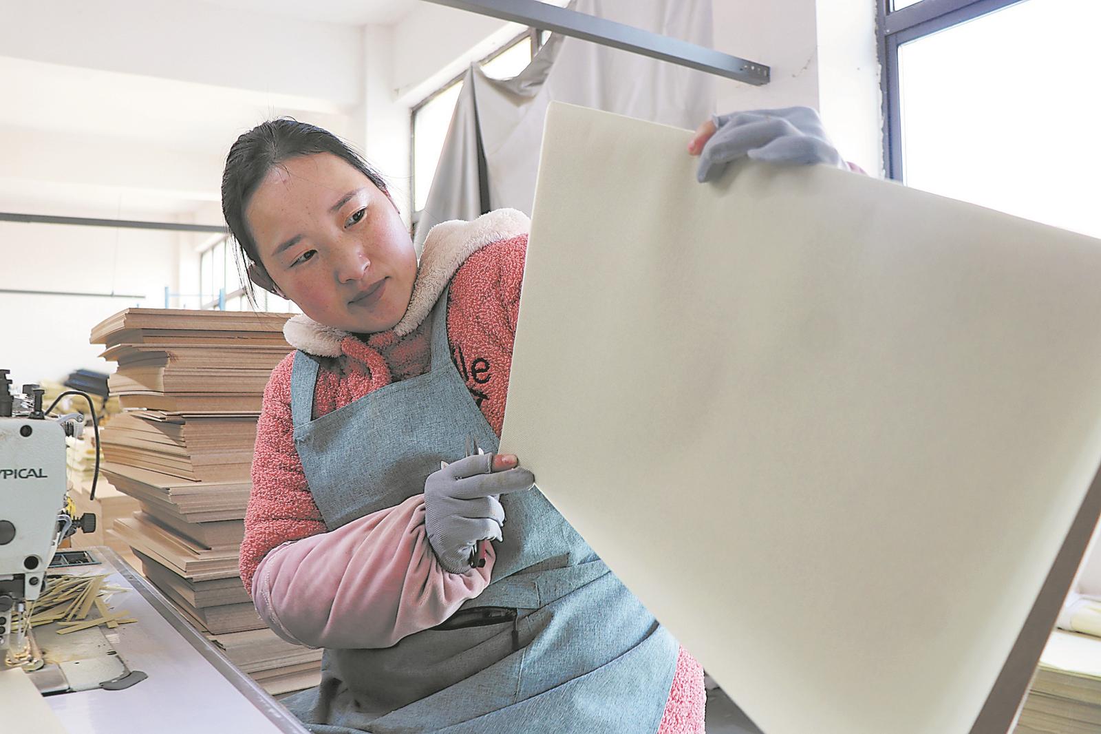 1月12日,亳州市谯城区牛集镇牛集村一家箱包厂生产车间,工人在制作箱包。近年来,牛集镇大力发展乡村箱包、电子、服装、足药包等微工厂,带动附近村民在家门口就业。通讯员 武清海 摄
