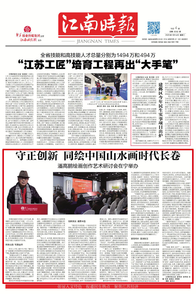 深情回望新华老报人艺术生涯,真情献礼《新华日报》87华诞。1月12日,由新华报业传媒集团、江苏省报业协会主办,江南时报社和新华文投共同承办的“高瞻远瞩·潘高鹏书画艺术回顾展”在新华全媒体艺术馆隆重开幕。开幕式后举办了潘高鹏绘画创作艺术研讨会,众多艺术名家、文化学者、高校专家等齐聚一堂,围绕潘高鹏的创新技法、绘画风格、艺术成就等深入交流,于守正创新中同绘中国山水画的时代长卷。