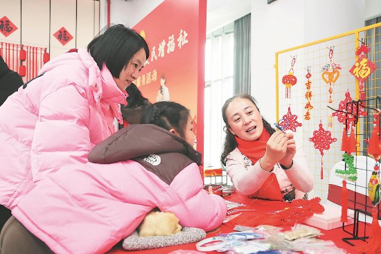 近日,在合肥市包河区工人文化宫,非遗传承人在向孩子们展示手工编织的工艺品。在新春来临之际,由安徽省总工会、合肥市总工会联合开展的“工会传真情 送福进万家”暨合肥市工会新春集市活动在包河区工人文化宫举行。记者 王珂 摄