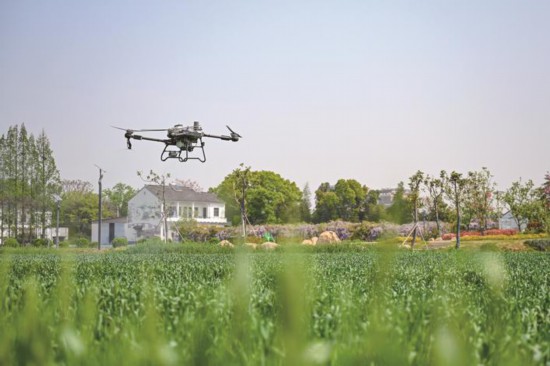 苏南早报网讯 嘉兴80万亩小麦进入抽穗期,防治病虫害显得尤为关键。4月9日,在南湖区余新镇长秦村,农机操作员操控着植保无人机,为小麦喷洒防治药水,助力小麦丰产丰收。(王振宇、孟多多)