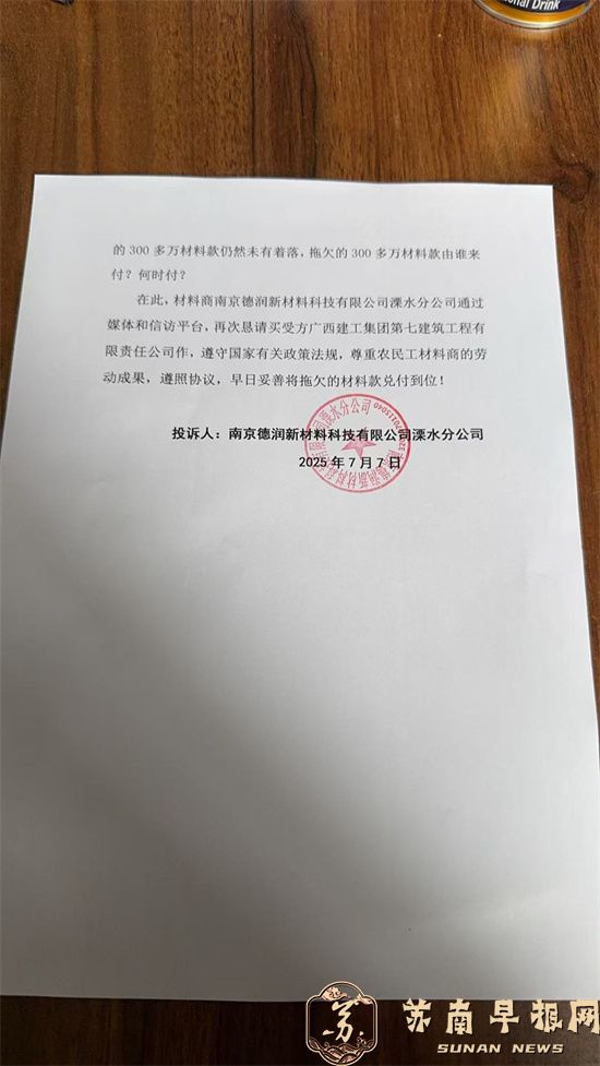 在此,材料商南京德润新材料科技有限公司溧水分公司通过媒体和信访平台,再次恳请买受方广西建工集团第七建筑工程有限责任公司遵守国家有关政策法规,尊重农民工材料商的劳动成果,遵照“购销合同”和“和解协议”,早日妥善将拖欠的材料款兑付到位!
