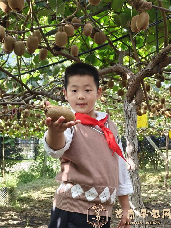 试吃环节结束后,农科院工作人员带领大家走进农科院的猕猴桃种植基地,参观学习猕猴桃种植方法。蔓延的树藤纵横交错,一颗颗圆滚滚、毛茸茸的猕猴桃缀满枝头,散发着淡淡清香,让大家目不暇接。孩子们兴奋地观察着不同品种的猕猴桃,忍不住相互分享自己所学的新知识。