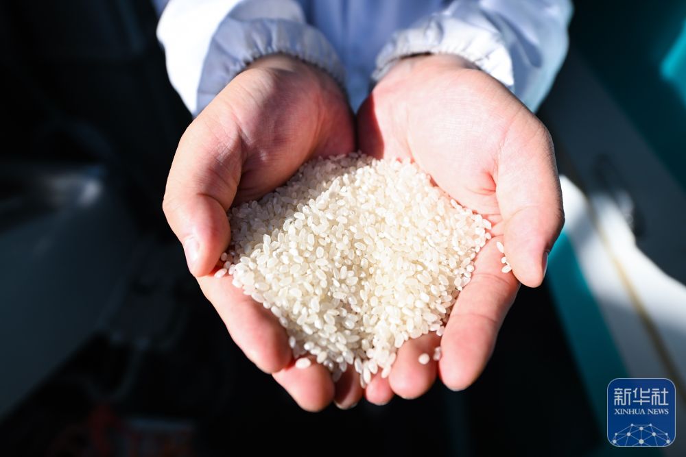 在江苏射阳大米集团有限公司自动化生产车间,工作人员展示加工完成的大米。(10月29日摄)