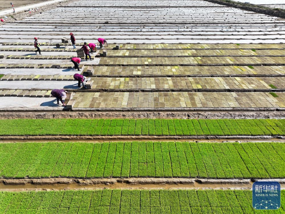 射阳县为民农机合作社农民在秧池摆放秧盘。(5月8日摄,无人机照片)