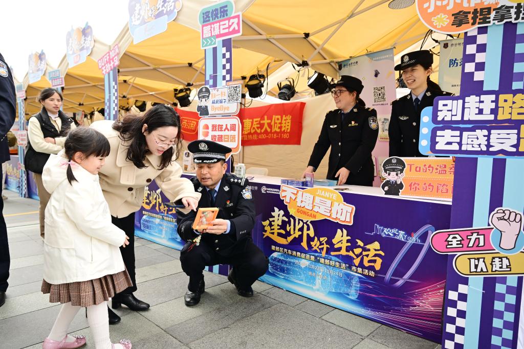 南京市公安局建邺分局组织民警来到“建邺好生活”市集活动现场,摆摊设点向群众宣传反诈知识。