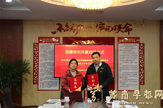 最后,双方共聚一堂,展开了深入的座谈交流。江苏固城湖青松水产专业合作联社党委副书记胡月华介绍了合作联社的发展历程以及党建方面取得的显著成就。公司技术总监朱小勋则聚焦于河蟹养殖产业,详尽阐述了公司的现状、挑战与机遇。我院党总支书记刘庆新首先概述了学校的整体概况,随后特别介绍了畜牧兽医学院在党建工作中的亮点与成果。党总支副书记、院长汪善锋则进一步细化了畜牧兽医学院的发展历程,详细介绍了水产养殖专业在师资力量、教学质量和科研创新等方面的卓越表现。在热烈而友好的氛围中,双方就党建共建与实习实践基地的合作事宜进行了深入而细致的洽谈。经过充分沟通与协商,我院党总支与江苏固城湖青松水产专业合作联社党委成功达成了党建共建协议,并举行了隆重的签约仪式。同时,双方还就大学生实习实践基地的建立达成了共识,并进行了正式的授牌仪式。此次合作将进一步整合资源,发挥校企双方优势,为高质量人才教育事业注入新动力,助力现代渔业与乡村振兴事业蓬勃发展。
