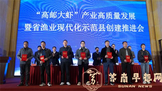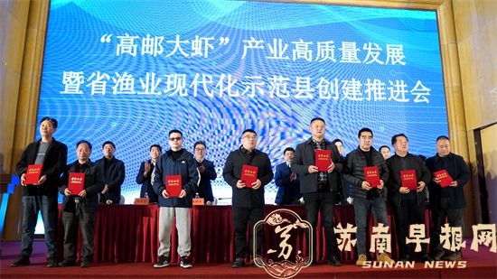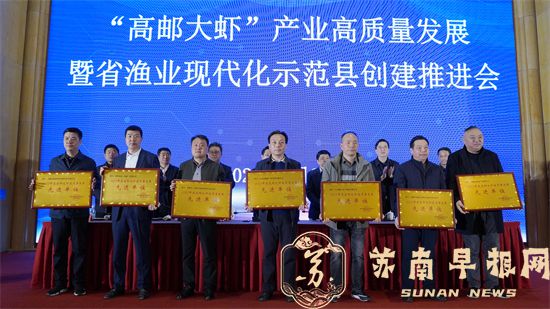 苏南早报网讯(文/翁正倩 图/陈寿康) 26日下午,高邮市召开“高邮大虾”产业高质量发展暨省渔业现代化示范县创建推进会。省渔业协会会长张朝晖,高邮市领导郑志明、潘建奇、张贵龙、张拥军参加会议,副市长赵国祥主持会议。
