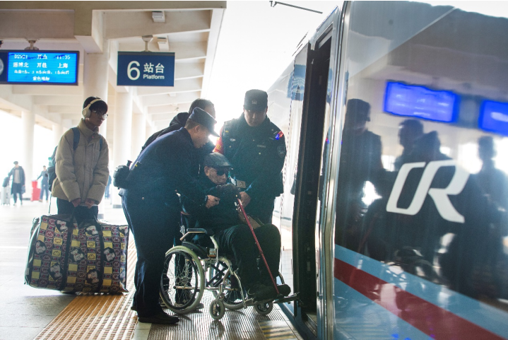 民警在帮助出行困难的旅客乘车。赵启瑞 摄