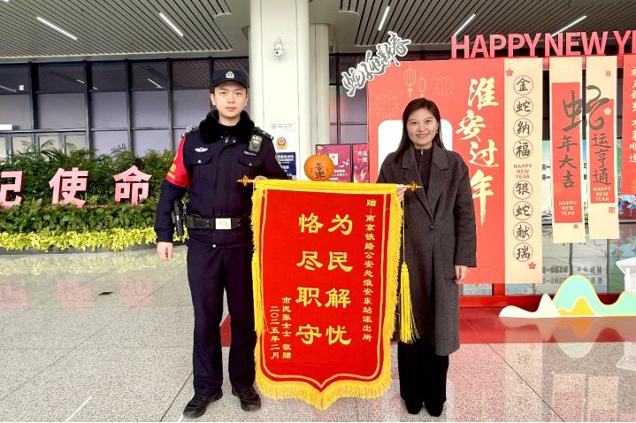出行旅客向民警送来锦旗表示感谢。赵启瑞 摄