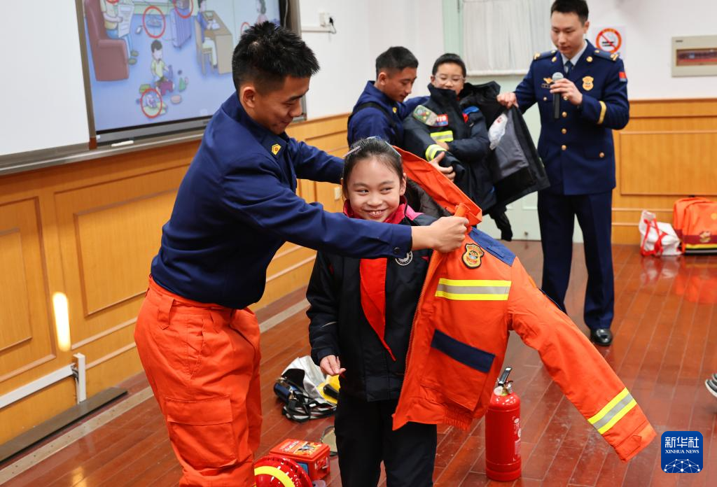 2月17日,上海市长宁区消防救援支队消防员在上海市开元学校“开学第一课”活动中指导学生体验穿戴消防员服装。