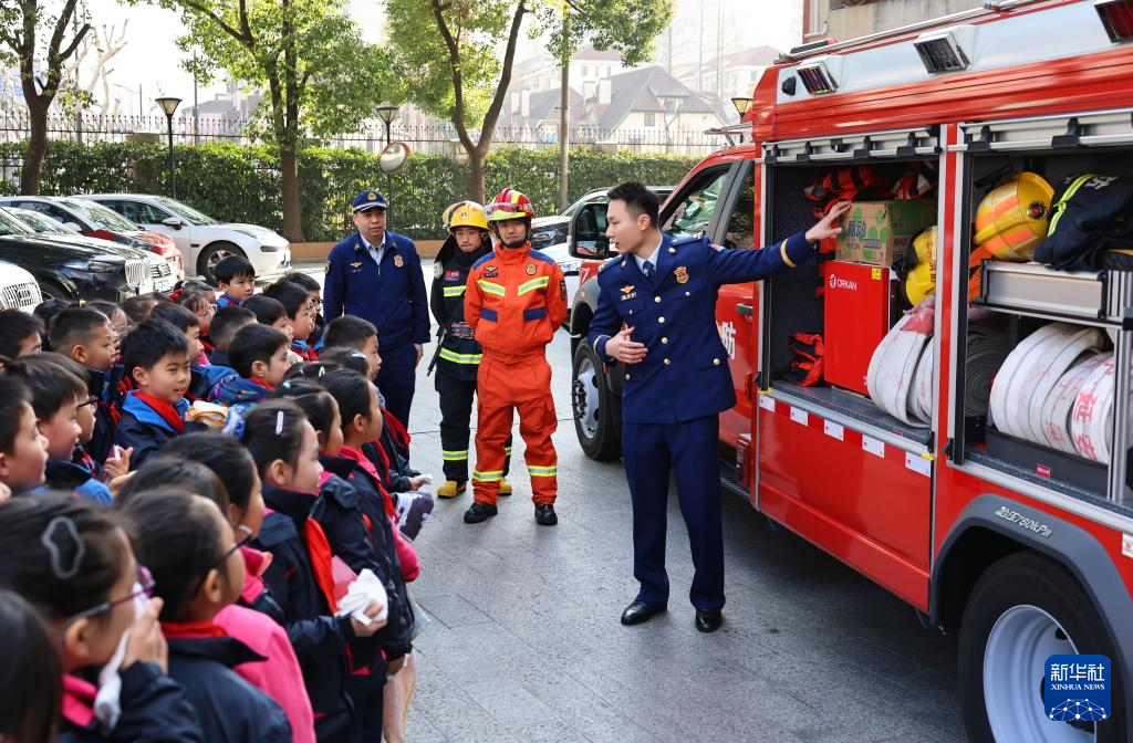 2月17日,上海市长宁区消防救援支队消防员在上海市开元学校“开学第一课”活动中为学生介绍消防车。