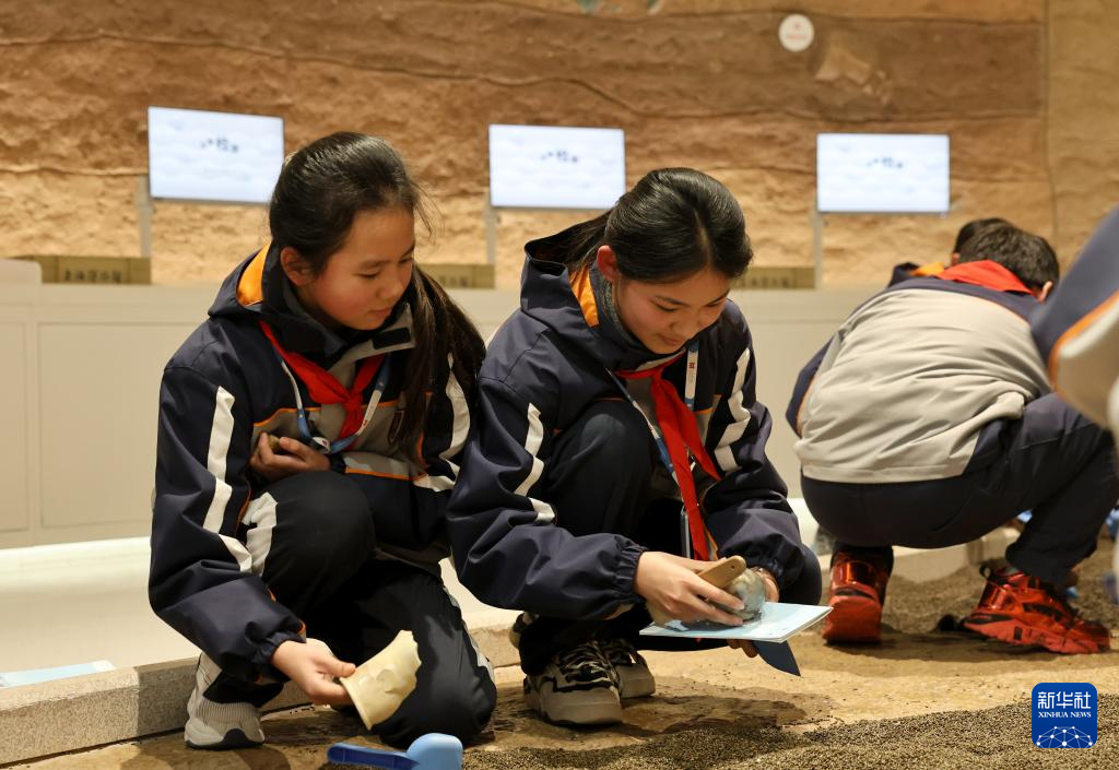 2月17日,在上海博物馆东馆,同济大学附属澄衷中学的学生在体验模拟田野考古发掘工作。