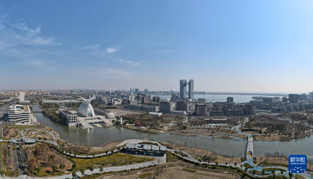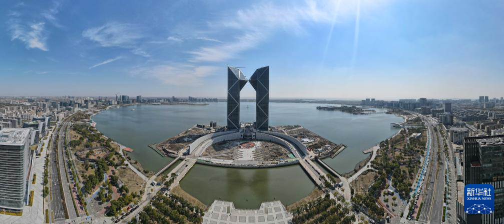 3月19日,空中俯瞰位于临港新片区滴水湖畔的中银金融中心大楼(无人机全景照片)。