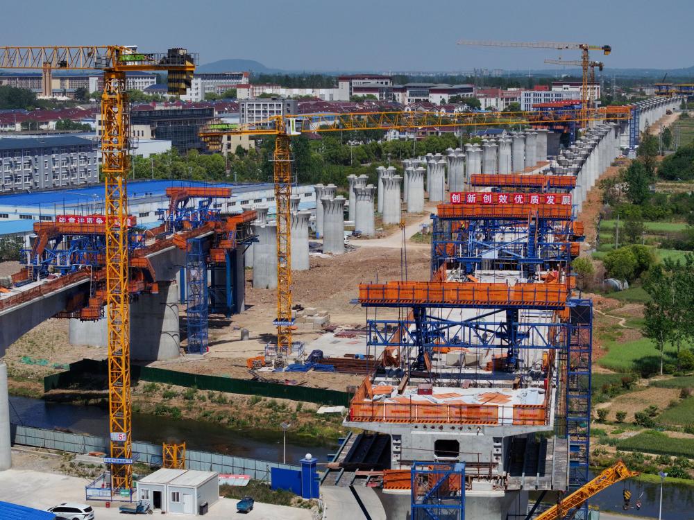这是4月26日用无人机拍摄的沪渝蓉高铁与宁淮城际铁路并行段跨招兵河连续梁施工现场。