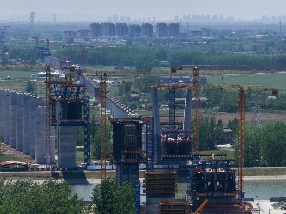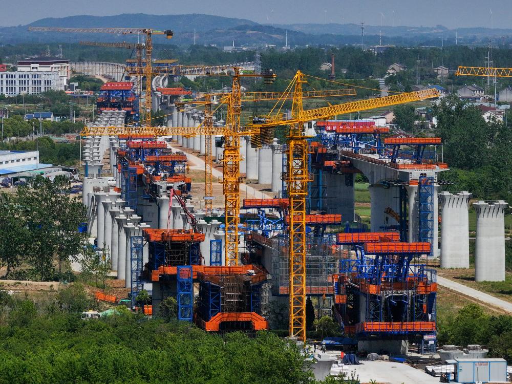 这是4月26日用无人机拍摄的沪渝蓉高铁与宁淮城际铁路并行段跨滁河桥梁施工现场。
