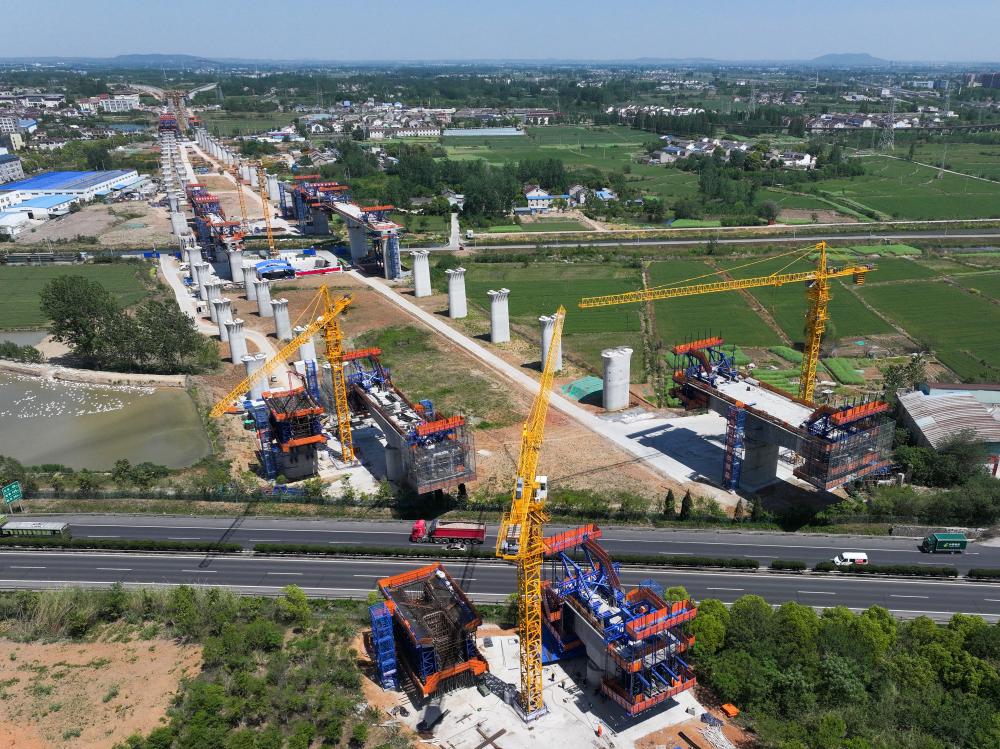这是4月26日用无人机拍摄的沪渝蓉高铁与宁淮城际铁路并行段跨G205国道连续梁施工现场。