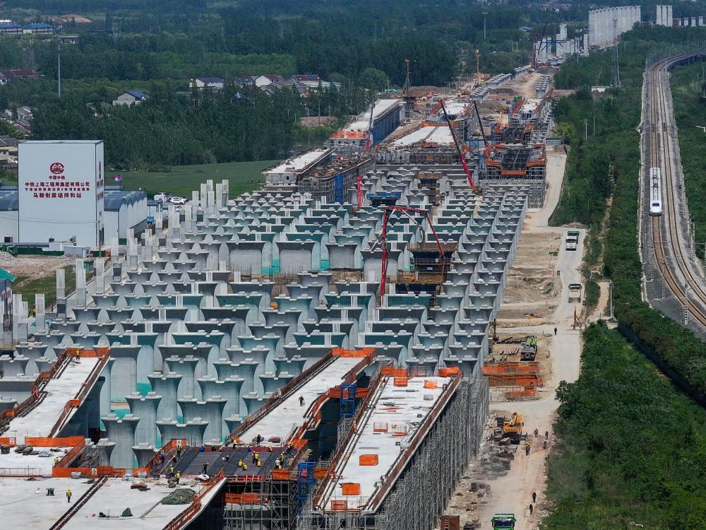 这是4月26日用无人机拍摄的沪渝蓉高铁与宁淮城际铁路并行段六合西站墩身及道岔梁施工。