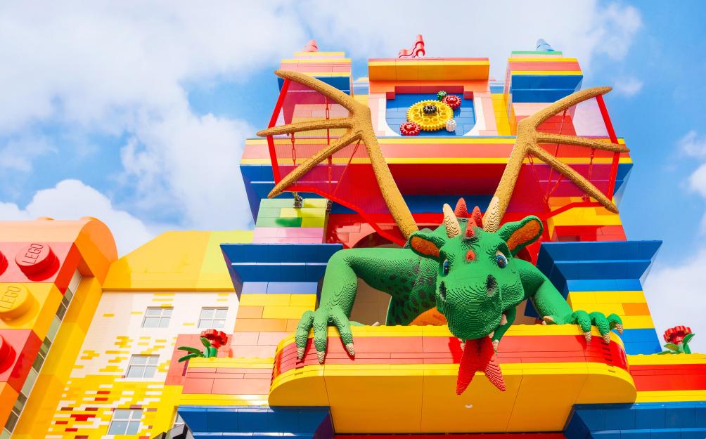 乐高乐园酒店门头和“小龙奥利”乐高模型。上海乐高乐园度假区供图