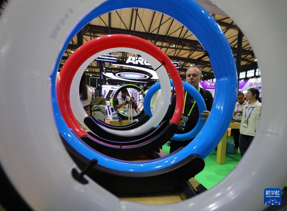 5月5日,在上海新国际博览中心举行的2025中国国际自行车展览会上,参观者在一组自行车轮胎展品前驻足观看。