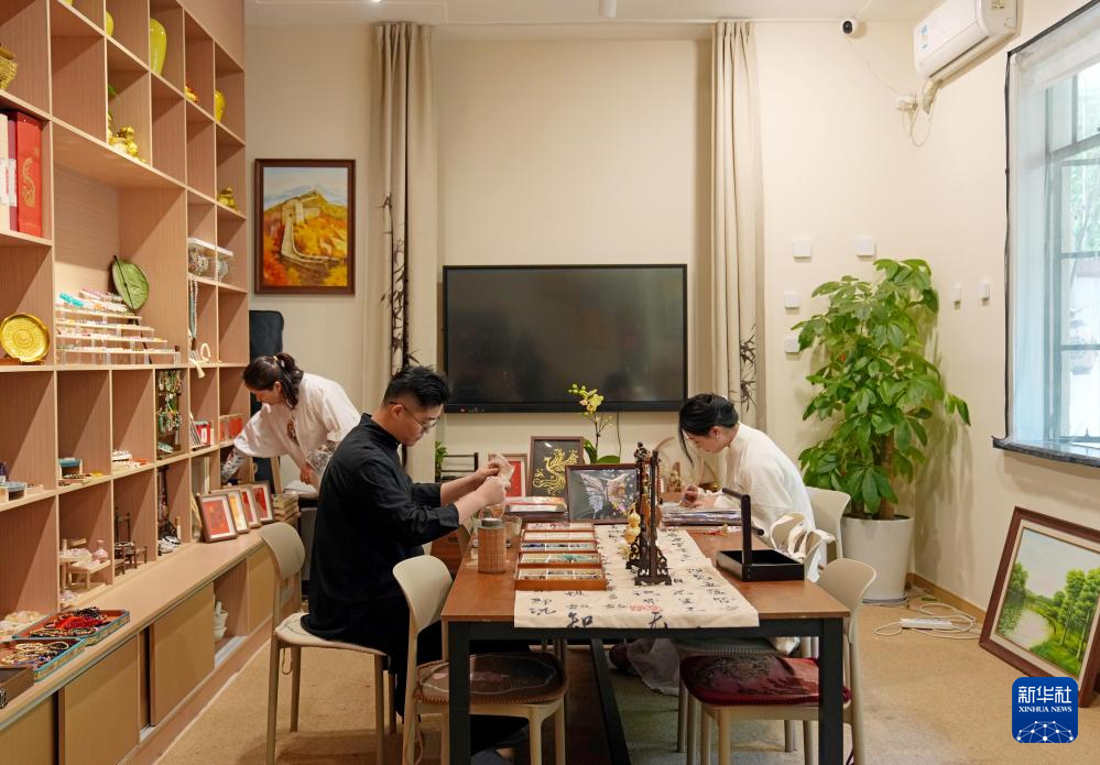 小店的手作课程团队成员小福在制作烧蓝发饰(4月18日摄)。