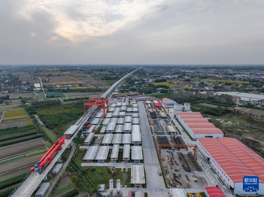10月27日拍摄的中铁十一局沪渝蓉高铁沪宁段搬经制梁场作业现场(无人机照片)。
