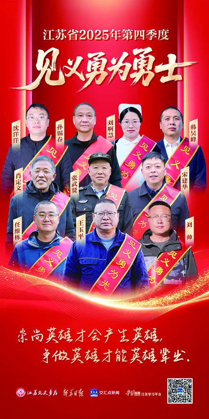 苏南早报讯 1月5日,江苏省见义勇为基金会发布2025年第四季度“省见义勇为勇士榜”,共有10位见义勇为勇士光荣上榜。他们当中,有奋不顾身跃入大海,在惊涛骇浪中数次冲锋成功救人上岸的王玉平;有不顾安危跳入河中,多次在水中拉开轿车车门勇救他人的孙锡春;有面对火灾危情毫不退缩,冲进火场救人排险的张武贤、沈洋洋;有直面利刃,巧用灭火器制服歹徒的任维栋;有怀孕休养,与死神抢时间,跪地进行心肺复苏的护士刘啊慧;有危急时刻跃入水中,奋起托举他人生命的肖定文、刘帅、宋建华、韩昊峰等人。这些平民英雄的职业不同、年龄各异,在一个又一个生死瞬间挺身而出,用勇敢、责任、担当,让整个社会感到浓浓的暖意。