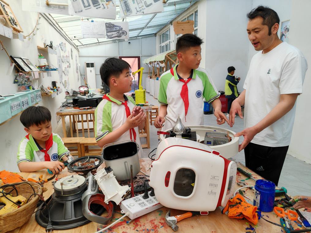 这是中国矿业大学学生学习木工活动。 新华社记者陈席元 摄邳州市城关实验幼儿园一块自然地,被改造成让儿童“自然生活、自在生长”的“绿城营地”,种菜、炒菜……孩子们忙得不亦乐乎,大(3)班的王瑞宵一圈圈磨着豆浆,满头大汗。