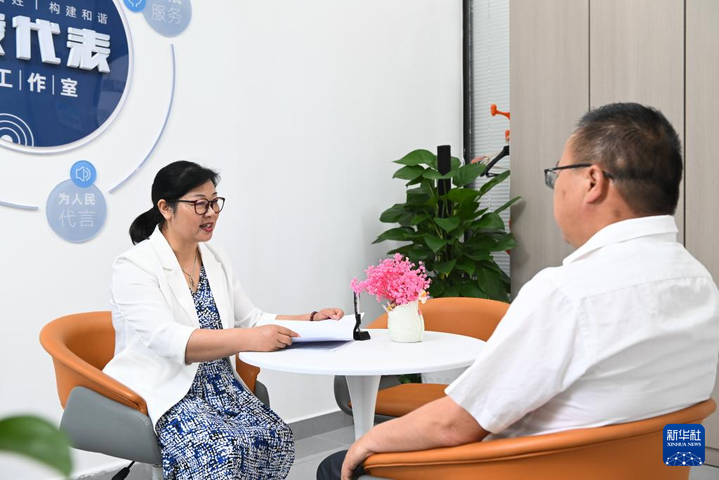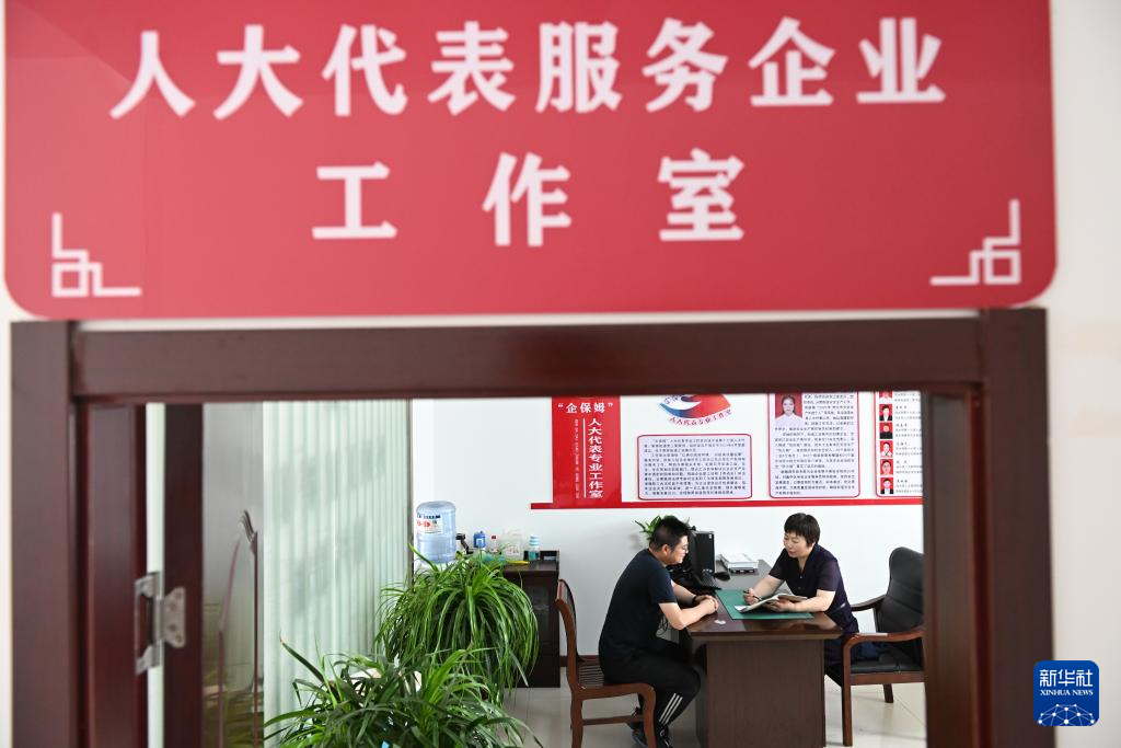 6月25日,在人大代表服务企业工作室,李中芹(右)在接待企业负责人。
